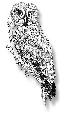 | Great Grey Owl. Drawn by Vern Montpetit. From Bird's Eye View | ||||||||||||||||||||||||||||||||||||||